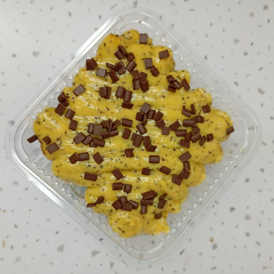 Nosso brownie recheado é composto por uma camada de brownie e uma camada na parte de cima de recheio cremoso de maracujá.