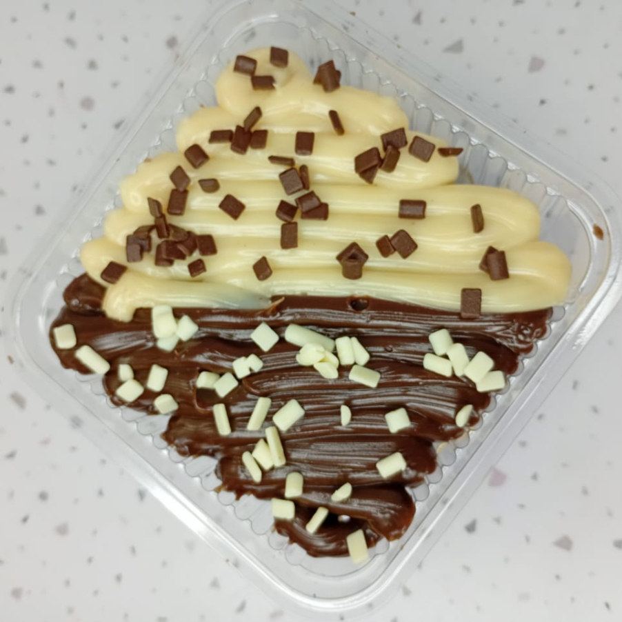 Brownie na marmita casadinho, nosso brownie tem sabor intenso de chocolate, doce na medida e um toque meio amargo, para ficar ainda melhor! Uma camada generosa de recheio cremoso de chocolate e chocolate branco, finalizado com granulado de chocolate nobre.