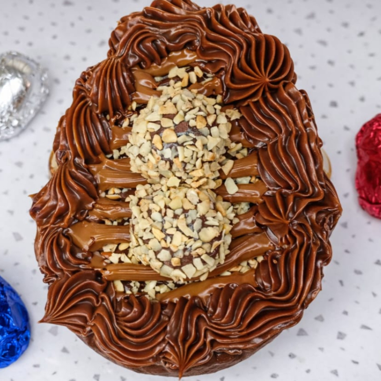 Bolo Gelado Ferrero Rocher Uma explosão de sabor! Feito com massa úmida de chocolate 50% cacau, molhada com calda cremosa de leite condensado. No topo, uma camada generosa de recheio cremoso de chocolate e Nutella Original, finalizado com castanha de caju granulada. Uma combinação irresistível para os amantes de chocolate!
