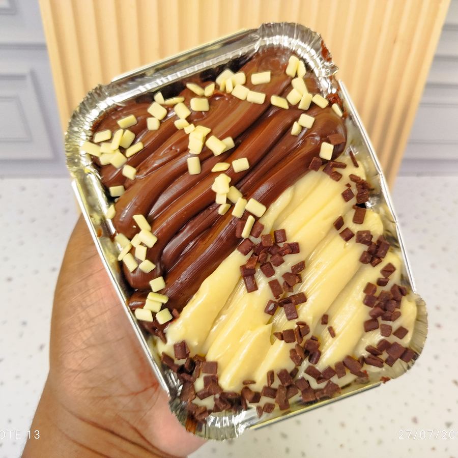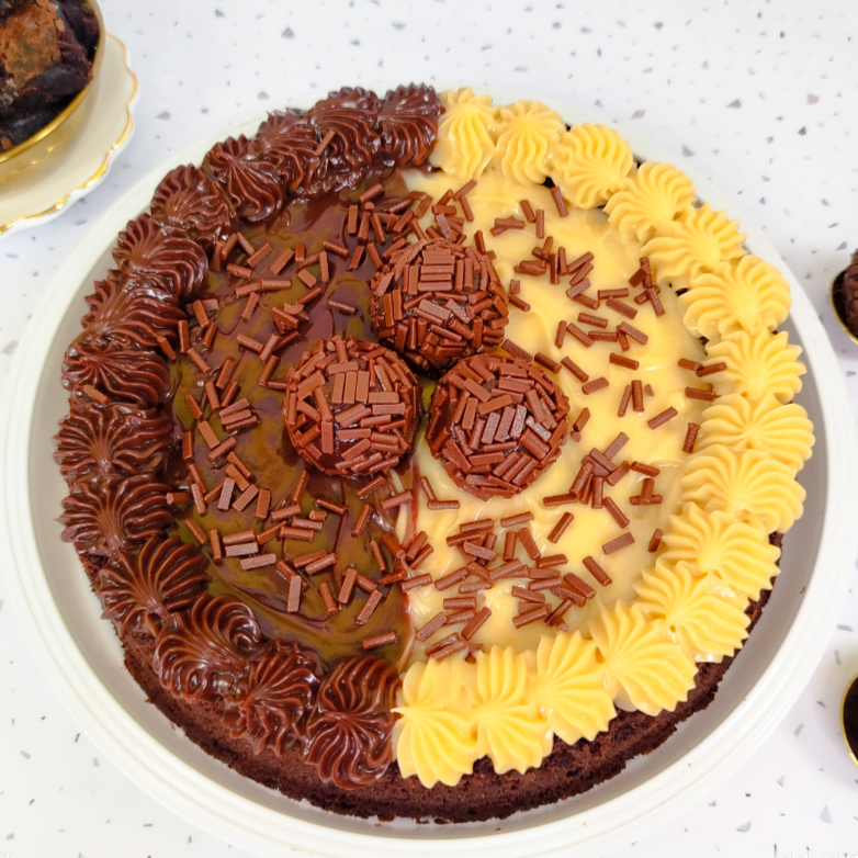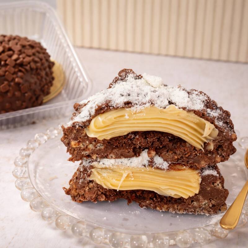 Uma explosão de sabor! Feito com massa úmida de chocolate 50% cacau, molhada com calda cremosa de leite condensado. No topo, uma camada generosa de recheio cremoso de chocolate e chocolate branco, finalizado com granulado de chocolate nobre que derrete na boca. Uma combinação irresistível para os amantes de chocolate!