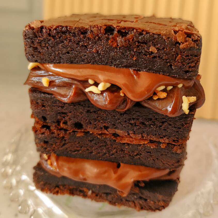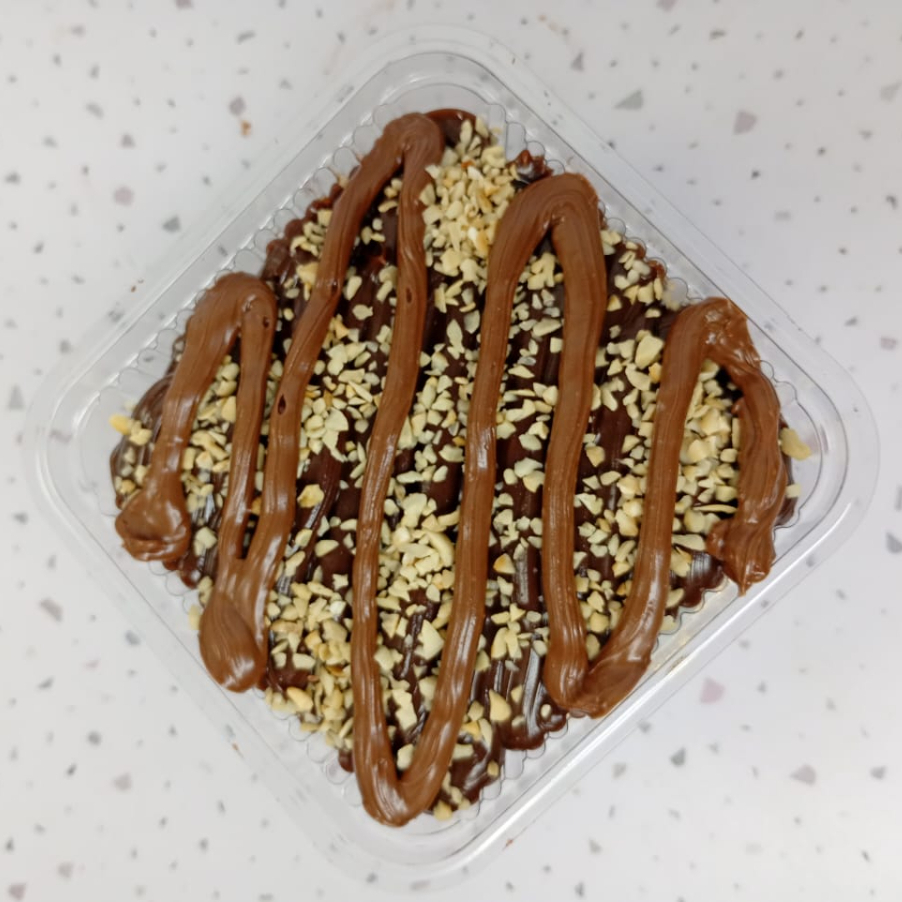 Nosso brownie recheado é composto por uma camada de brownie, uma camada de recheio cremoso de chocolate, castanha de caju e fios de Nutella.
