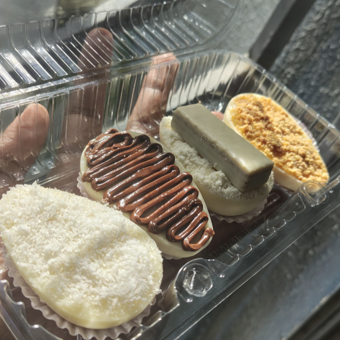 O kit contém 4 mini ovos recheados, com casca de chocolate branco, ótima opção para presentear ou degustar. Obs: Embalagem enviada conforme disponibilidade da loja.