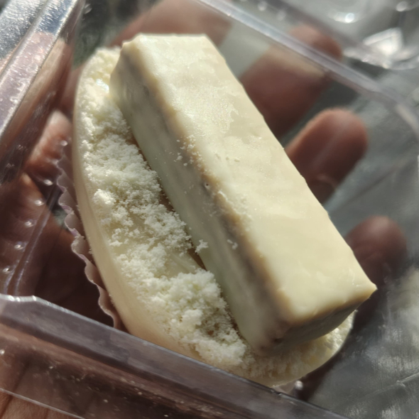 Delicioso chocolate branco com recheio de ninho e finalizando com bis.
