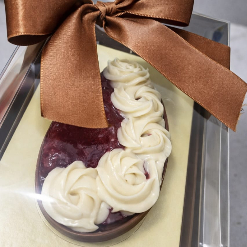 Delicioso ovo de colher de 150g, ninho com geleia de morango e casca meio amarga.