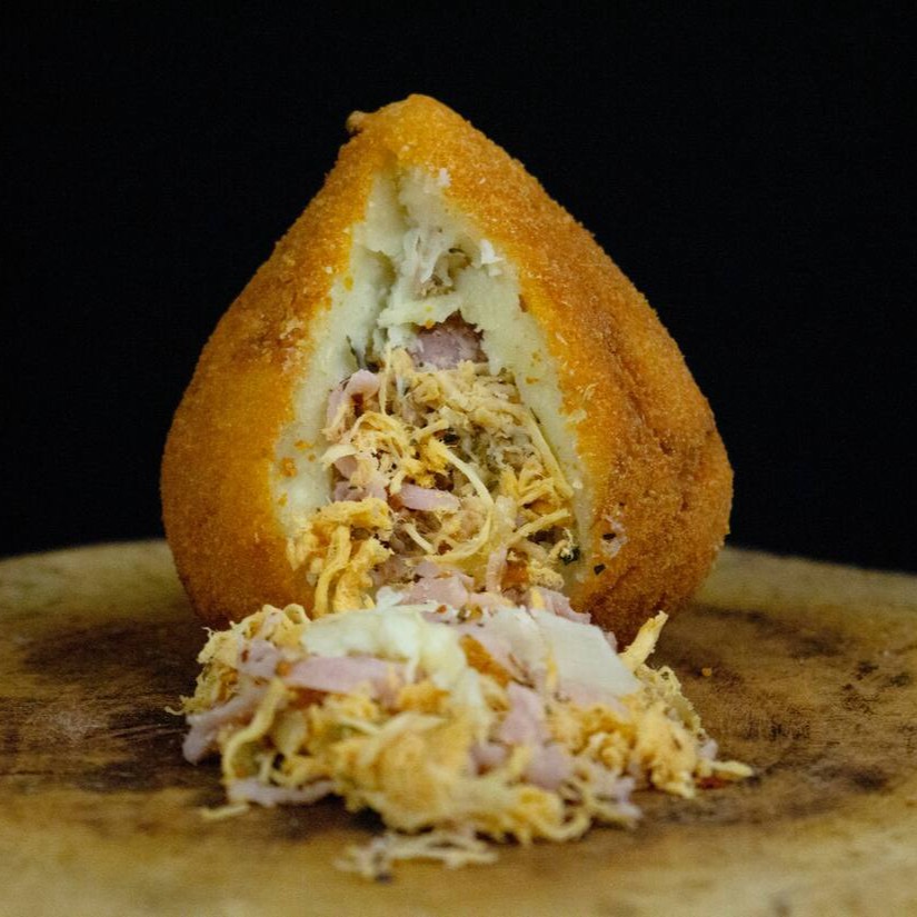 Deliciosa coxinha de italiana quem vem frango, presunto e pimenta calabresa