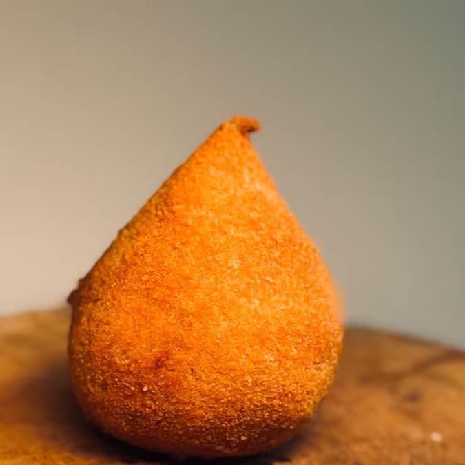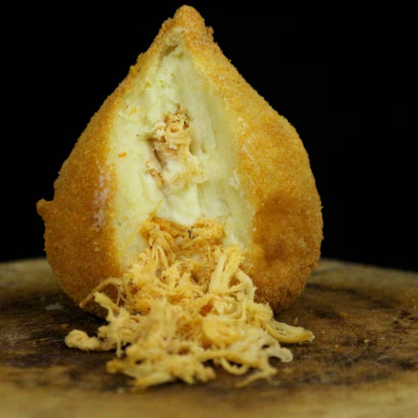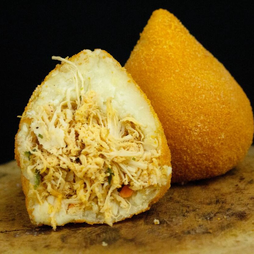 Coxinha de frango crocante por fora e recheada com frango bem temperado.