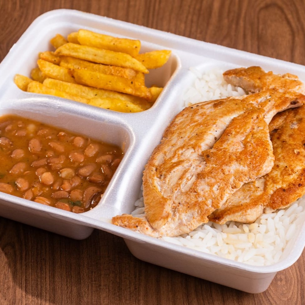 Filé de Frango Grelhado, acompanhado com feijão de caldo da Demita, arroz soltinho e fritas em uma única marmita! Peça agora para uma experiência completa e deliciosa. ‘’Peça já e desfrute das nossas Marmitas com Divisórias que lhe da uma experiência única em cada garfada! #Filédefrango #Grelhado #Marmita #Feijãodecaldo #Arrozefritas # #Delivery