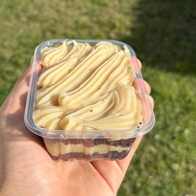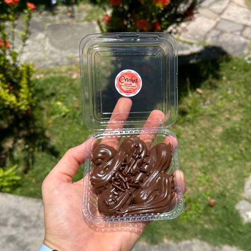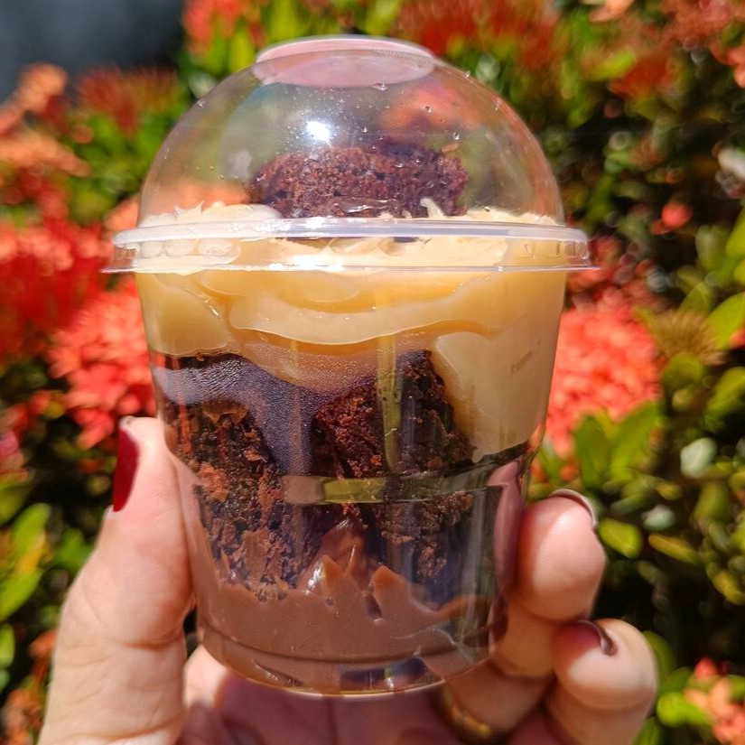 Brownie de massa úmida e cobertura cremosa (Ninho ou Tradicional).
