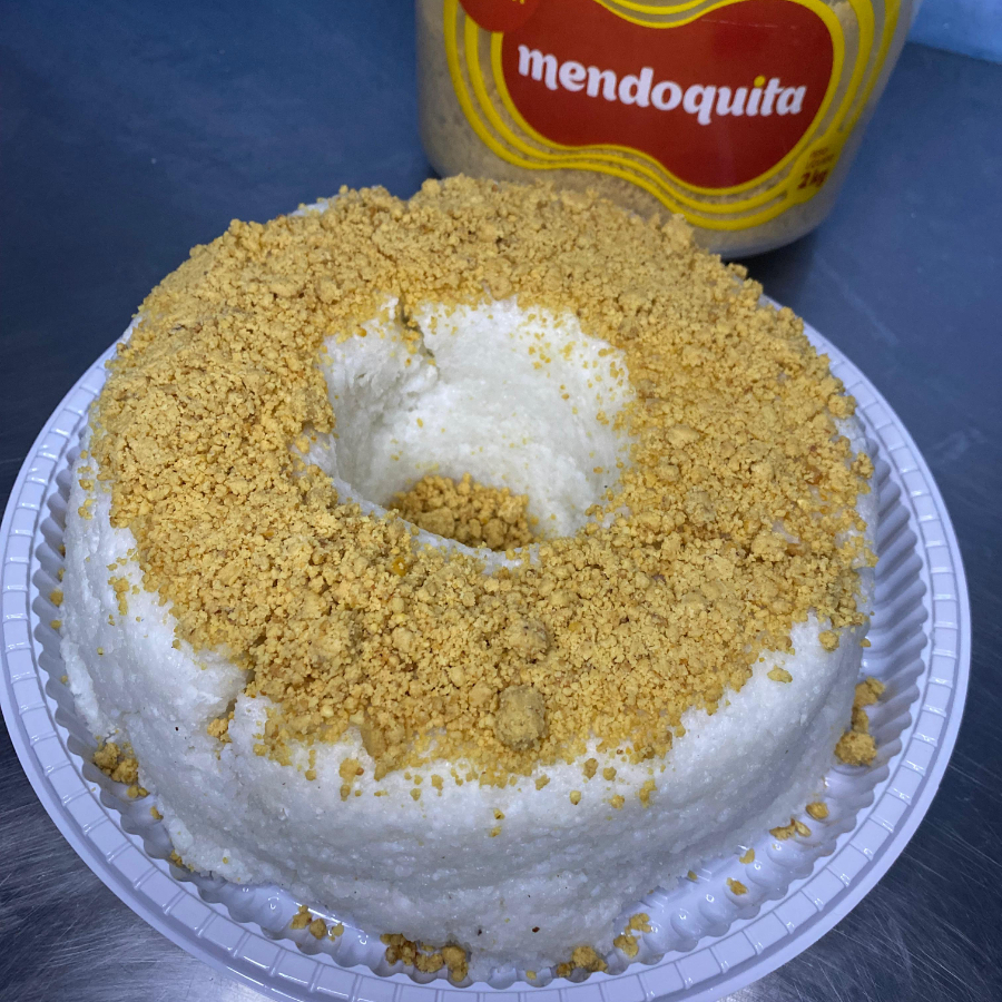 UM CUSCUZ DE TAPIOCA EM FORMA DE BOLO COM PAÇOCA