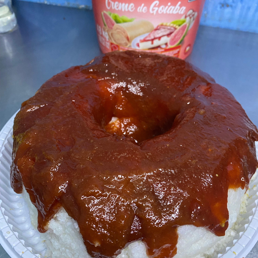 um cuscuz de tapioca em forma de bolo com calda de goiabada