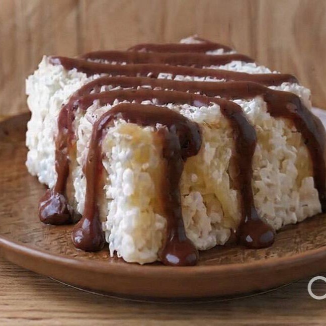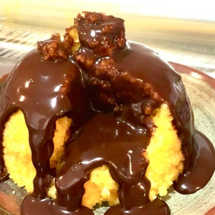 Cuscuz fofinho revheado com queijo mussarela e Nutella. Cono cobertura acompanha a calda de chocolate ganache.