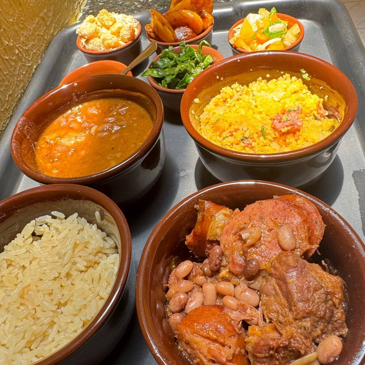 A Feijoada com cuscuz é composta por: Feijão, carnes diversas, farofa de banana, farofa de cuscuz, salada vinagrete e couve refolgado no bacon.