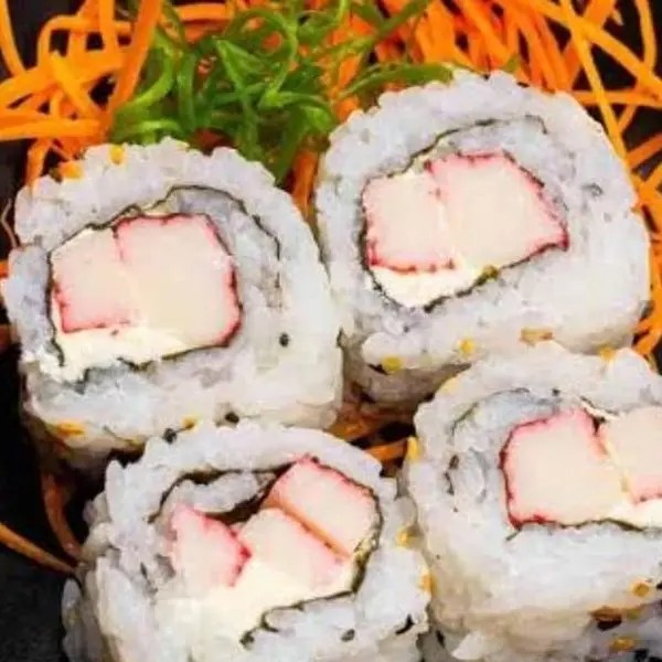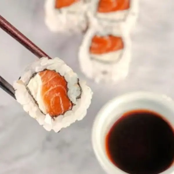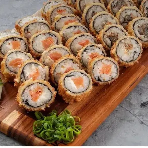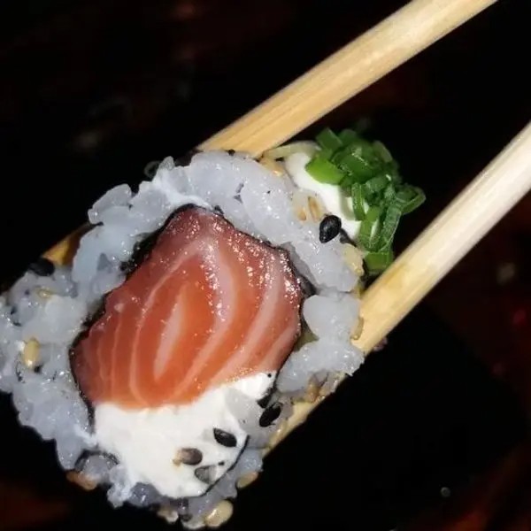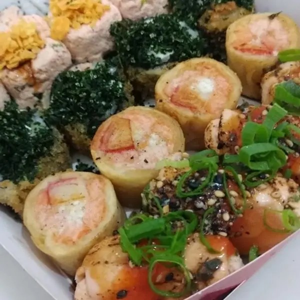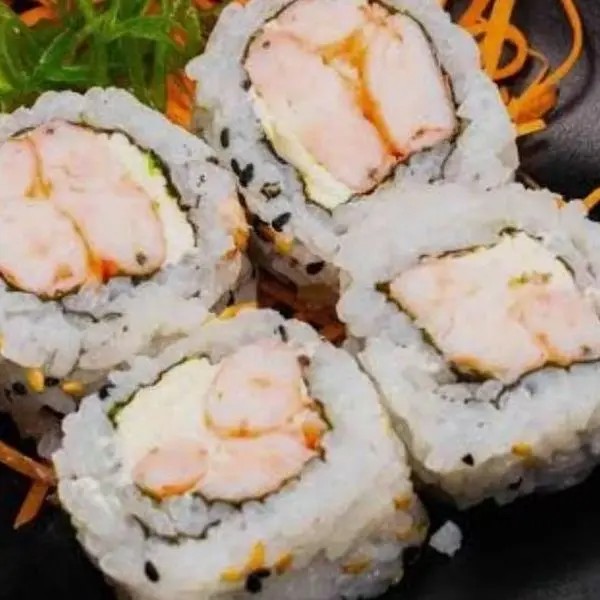 Recheio de Salmão cru, camarão arroz japonês, cream cheese, cebolinha e molhos especiais.