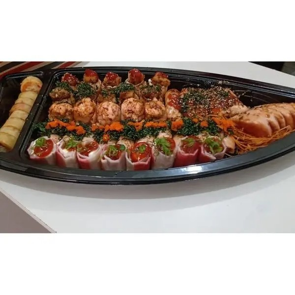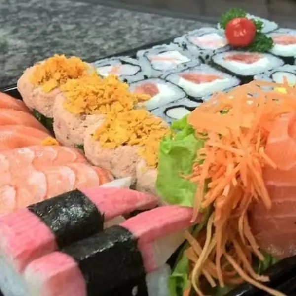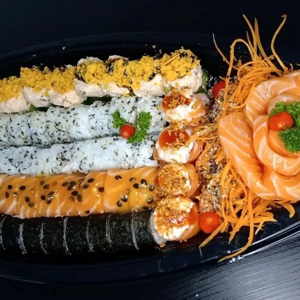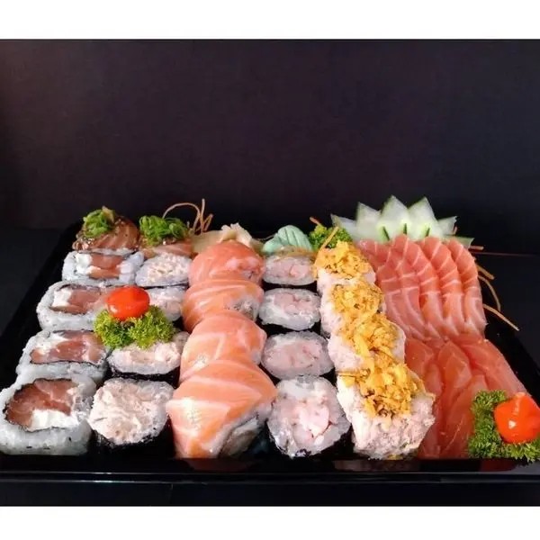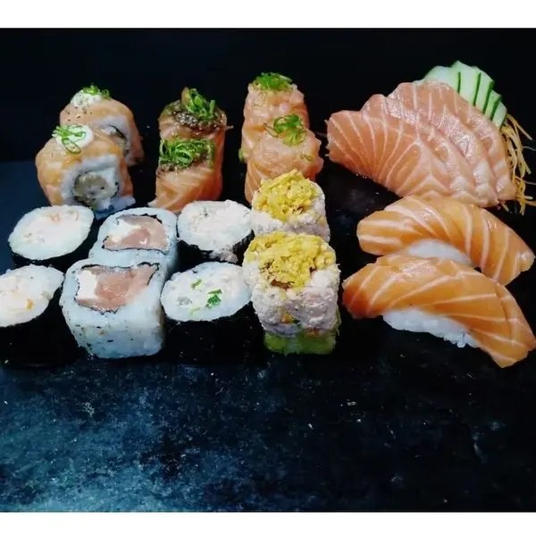 3 sashimi 6 hossomaki de salmão grelhado 6 uramaki tropical 6 hossomaki de camarão 6 acelga de salmão grelhado 2 niguiri de kani 3 niguiri de salmão 2 joy de camarão 6 hossomaki de salmão fresco.