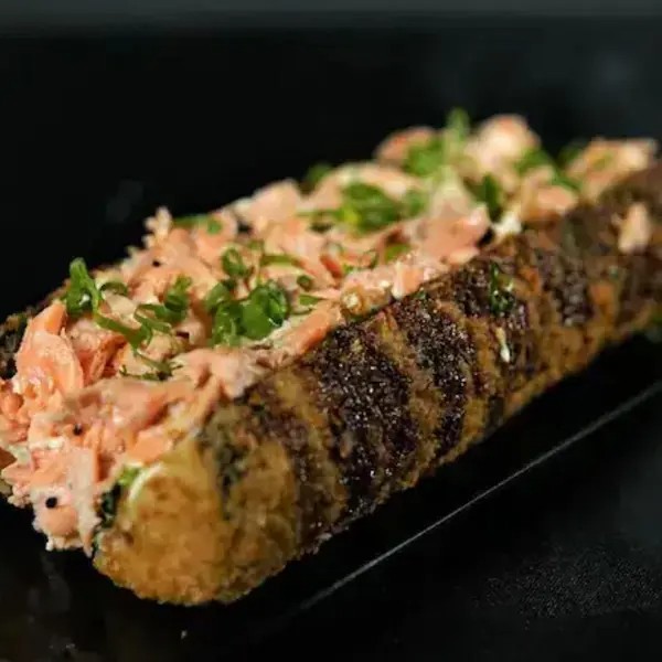 Enrolado no formato de cone com arroz, salmão grelhado, cream cheese, cebolinha, alga nori empanado na farinha panko e frito.