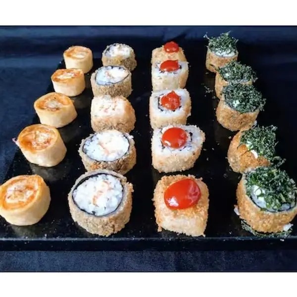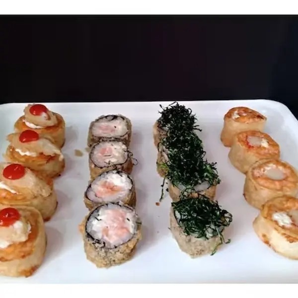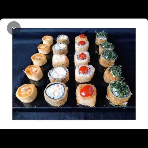 4-uramaki salmão 4- hossomaki salmão grelhado 4- hossomaki camarão 4- Ebi tem (especial) 4-Acelga maki 2-joy shimeji 3- Niguiri salmão 5- sashimis