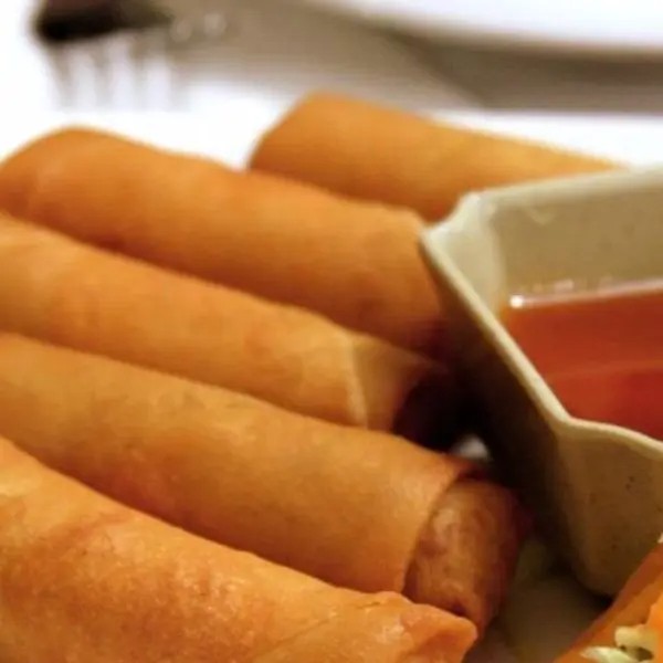Camarão, Arroz, Cream Cheese e Cebolinha. Enrolado no formato de cone na massa harumaki e frito.