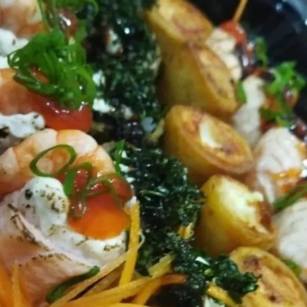 Camarão Salmão grelhado arroz japonês, cream cheese, cebolinha e molhos especiais do chef.