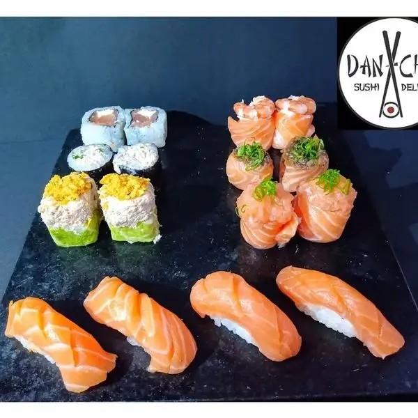 5 Dan Chai maki com recheio de salmão, 5 joy de camarão e shimeji, 5 niguiri , 5 joy de camarão empanado, 5 shake couve, 5- sashimi maçaricado.