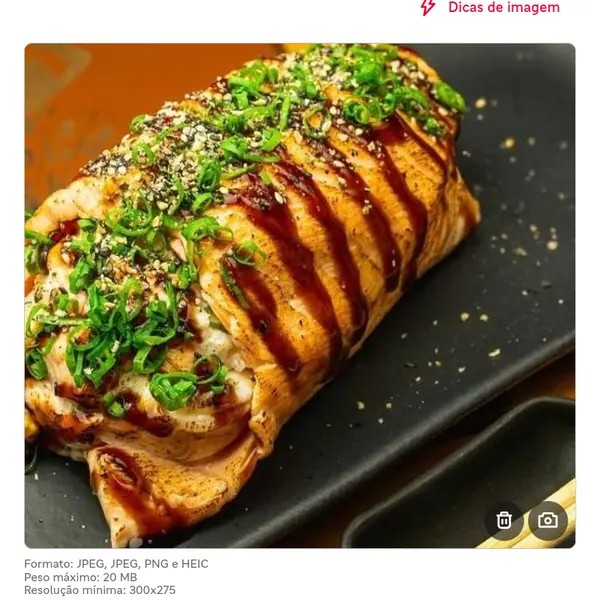 - Hot Roll empanado e frito - Recheio de salmão batido cru - Cream Cheese por cima - Cebolinha - Gergelim - Tarê