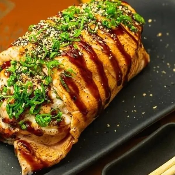 - Hot Roll empanado e frito - Recheio de salmão grelhado - Cream Cheese por cima - Cebolinha - Gergelim - Tarê