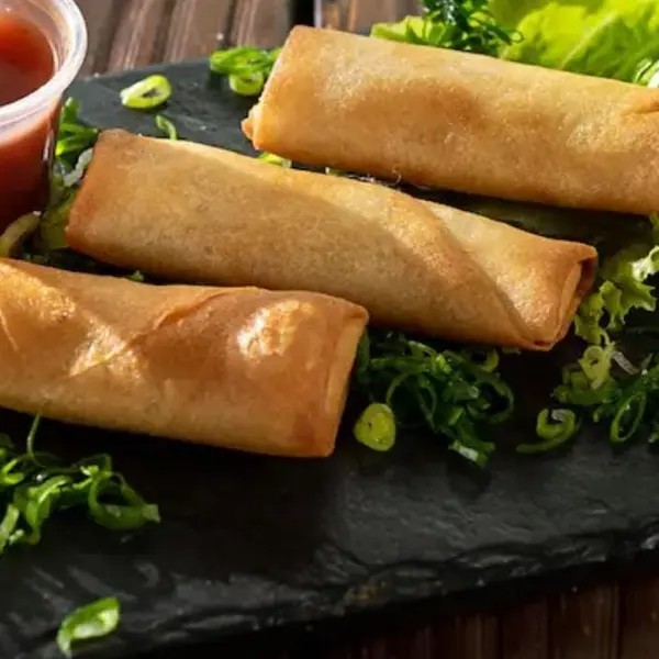 Salmão Grelhado, Camarão, Arroz, Cream Cheese e Cebolinha. Enrolado no formato de cone na massa harumaki e frito.