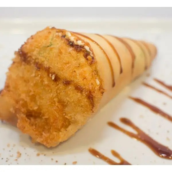 Enrolado no formato de cone com arroz, salmão grelhado, camarão, cream cheese, cebolinha, alga nori empanado na farinha panko e frito.