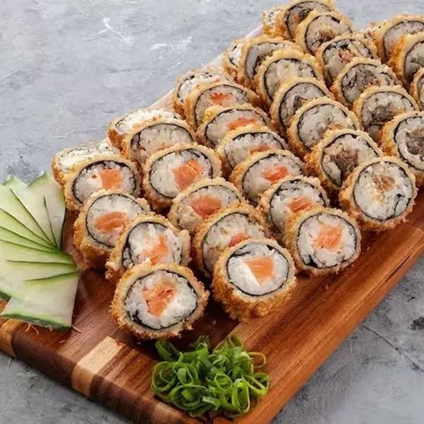 Enrolado no formato de cone com arroz, salmão fresco, cream cheese, cebolinha, alga nori empanado na farinha panko e frito.