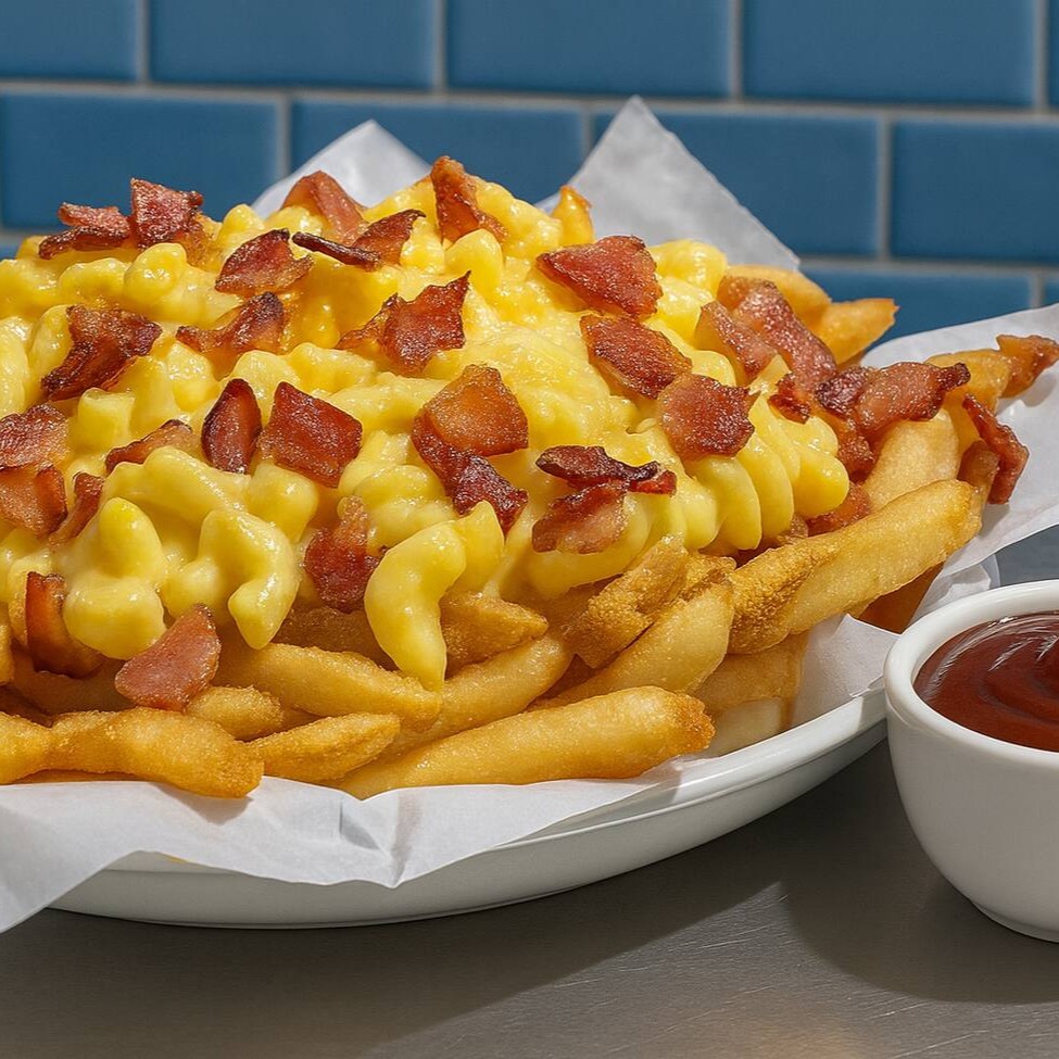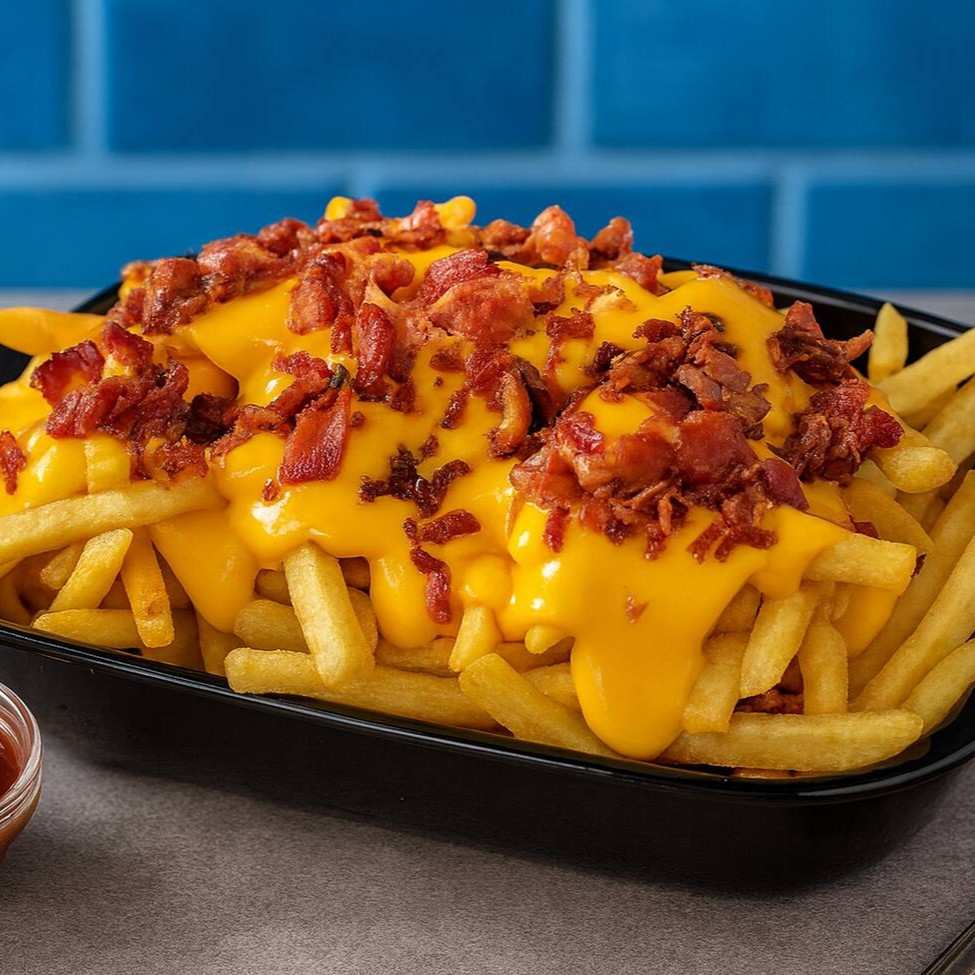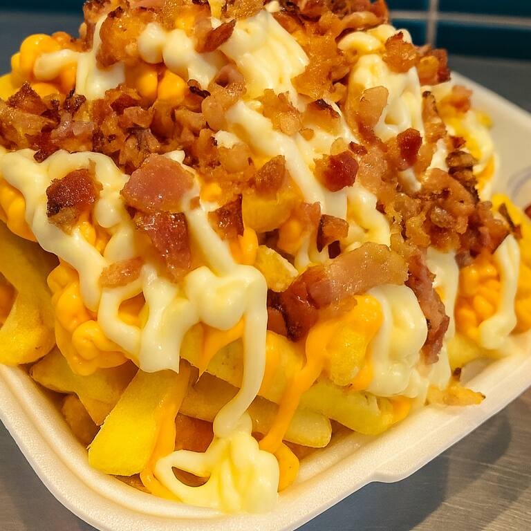 Essa e a batata chef da casa. Ela acopanhar 300gr de batata frita + cheddar cremoso, Catupiry Original, bacon frito em cubos. Barbecue e orégano. Aproximadamente 500gr.
