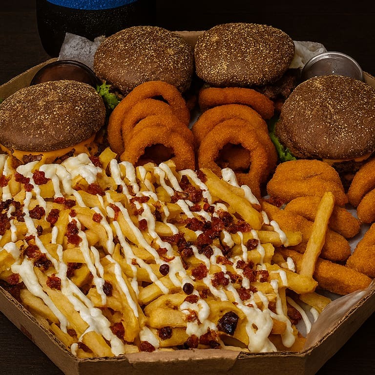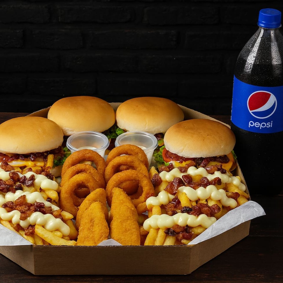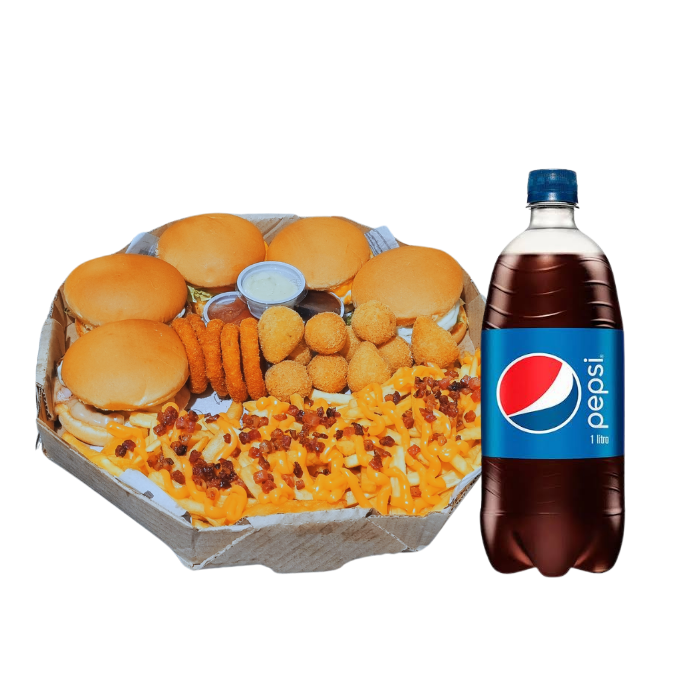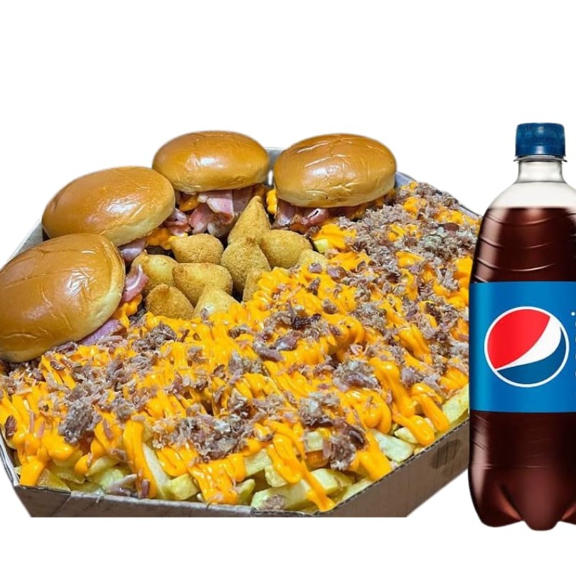 Esse super combo acopanhar 04 sanduíches (02 X calabresa ao Catupiry + 02 X bacon cheddar) + 10 nughts + 10 aneis de cebola + molho especial grátis + catchup e barbecue grátis + Pepsi 1lt grátis.