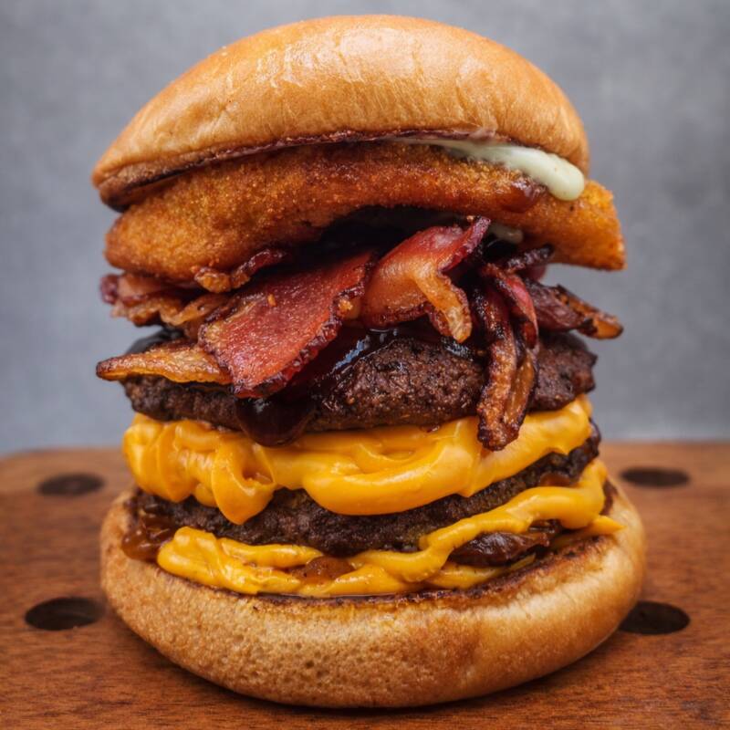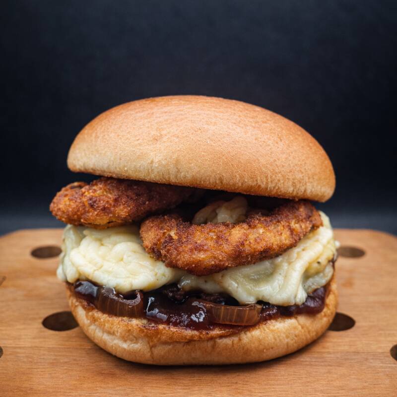 Pão de brioche selado na manteiga, 02 belnds de fraldinha 100gr cada, grelhado na chapa, 02 camadas de cheddar cremoso polengh, bacon frito em tiras, onion rings crocantes, cebola caramelizada e molho barbecue.