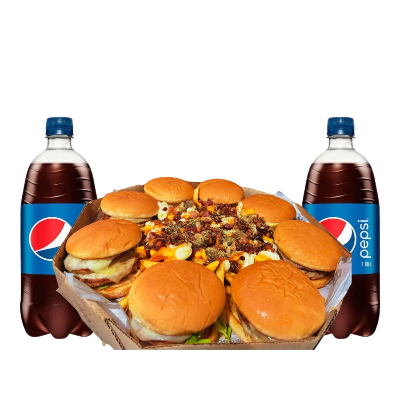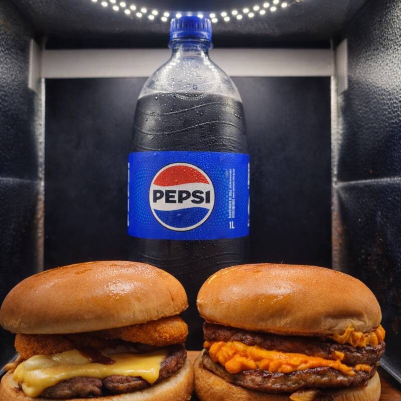 Acompanhar dois sanduíches da sua escolha( duplo x burguer, duplo cheddar, onion burguer, x bacon ou x calabresa)+ Pepsi de 1lt.
