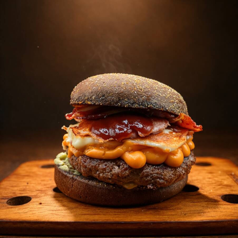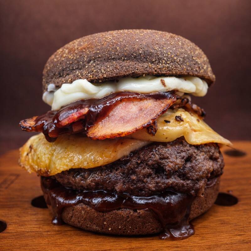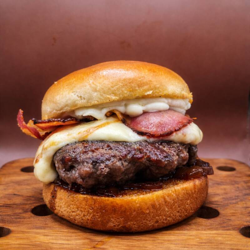 Pão australiano selado na manteiga, blend de patinho 150gr, grelhado na chapa, 02 fatias de queijo provolone defumado, assado na chapa, bacon frito em tiras, catupiry original cremoso, cebola caramelizada e molho barbecue.