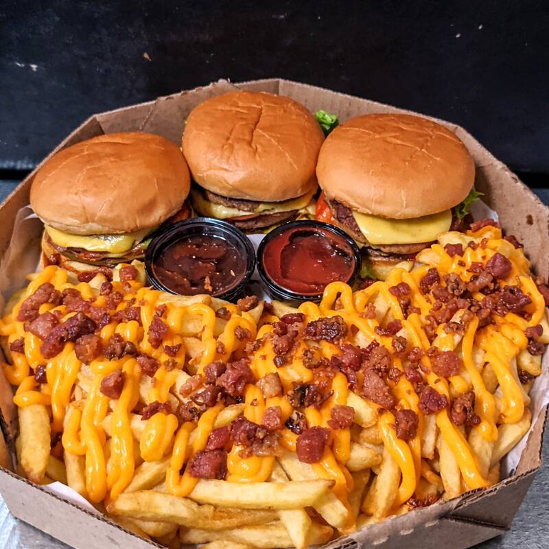 SUCULENTO COMBO ARTESANAL. ACOMPANHAR 03 CHESSE BACON CHEDDAR(PÃO DE BRIOCHE OU AUTRALIANO, BLEND DE PATINHO 100GR, QUEIJO, CHEDDAR POLENGHI, BACON FRITO EM TIRAS, CEBOLA CARAMELIZADA E MOLHO BARBECUE) + BATATA GOURMET + PET 1LT.