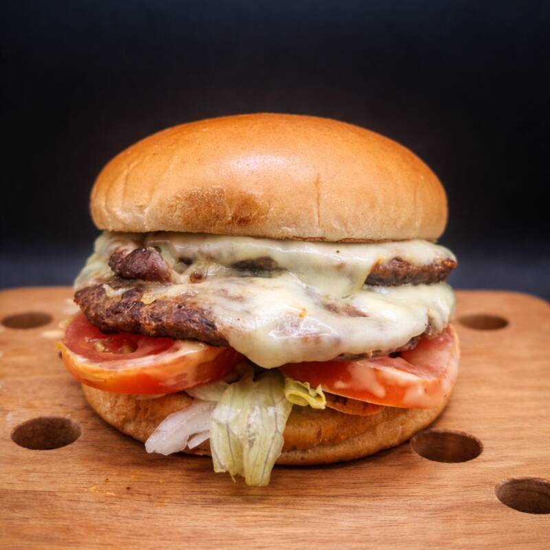 Pão smart selado na manteiga, 02 hamburguer bovino de 56gr cada, 02 fatias de queijo prato, molho americano a base de pickles, alface americano e tomates frescos.