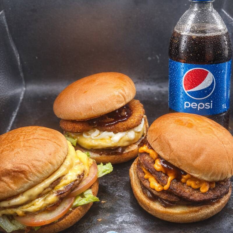 Este combo traz três sanduíches fartos aos amantes de sabores clássicos, permitindo-lhe escolher entre Duplo Cheddar, Duplo X-Burguer ou Onion Burguer. Para incrementar ainda mais, oferecemos um molho especial gratuito, com até 05 opções distintas, Para acompanhar, uma Pepsi de 1 litro, servida bem gelada. Um combo perfeito para quem deseja uma refeição completa e saborosa.