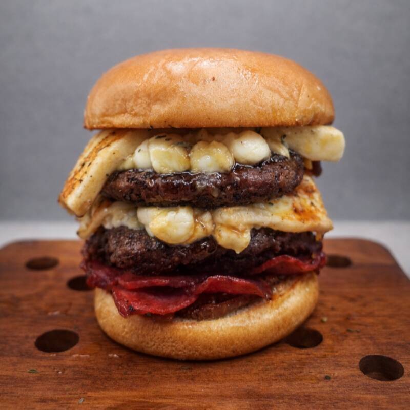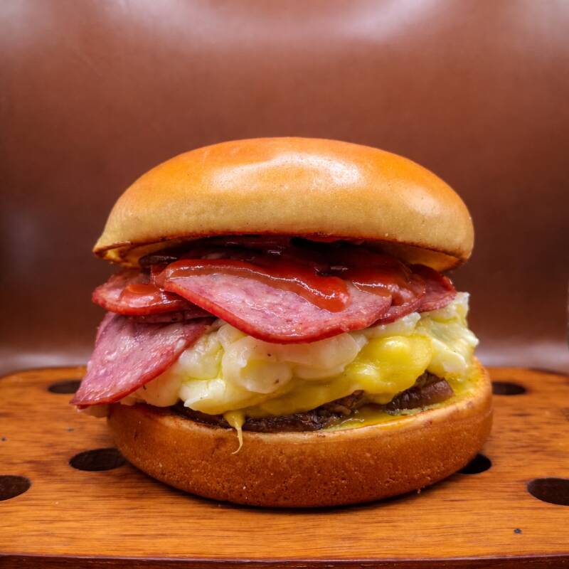Pão Autraliano selado na manteiga, blend de patinho 150gr, grelhado na chapa, bacon frito em tiras, queijo cualho assado na chapa, cheddar cremoso polengh, cebola caramelizada e molho barbecue.