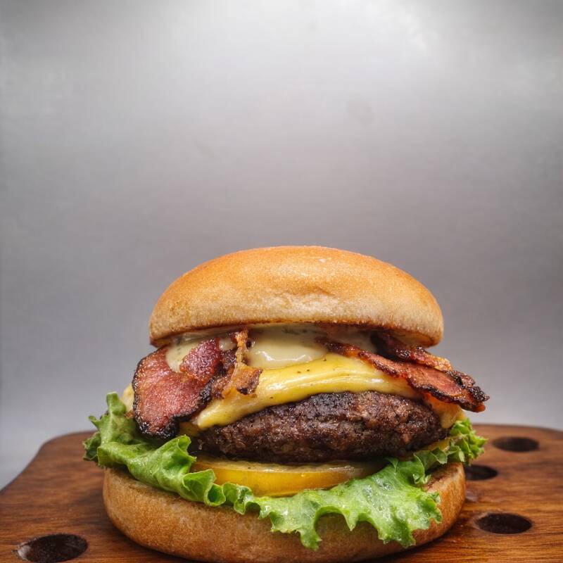 Pão de brioche selado na manteiga, belnd de fraldinha de 100gr grelhado na chapa, 02 fatias generosas de queijo prato derretido., bacon frito em tiras, maionese verde da casa, alface americano e tomates frescos.