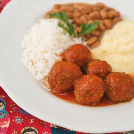 Almôndegas caseira finalizada com queijo mussarela e molho de tomate caseiro servido com arroz soltinho, feijão caseiro, macarrão ao alho e óleo e um cremoso purê de batata. Uma refeição completa, saborosa e feita para matar a fome com muito sabor! Marmita indicada para 01 pessoa.