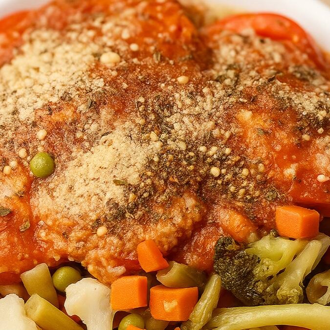 Prato composto pelo filé de frango grelhado, coberto com rodelas de tomate, queijo mussarela, finalizado com molho de tomate, orégano e queijo ralado servido com arroz soltinho, feijão caseiro, macarrão ao alho e óleo e um cremoso purê de batata. Uma refeição completa, saborosa e feita para matar a fome com muito sabor! Marmita indicada para 01 pessoa.
