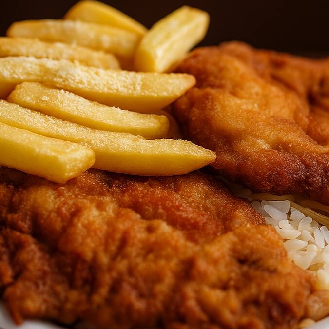 Steak de Frango acompanhado de arroz, feijão, macarrão, purê de batata