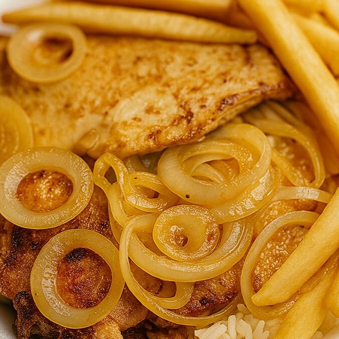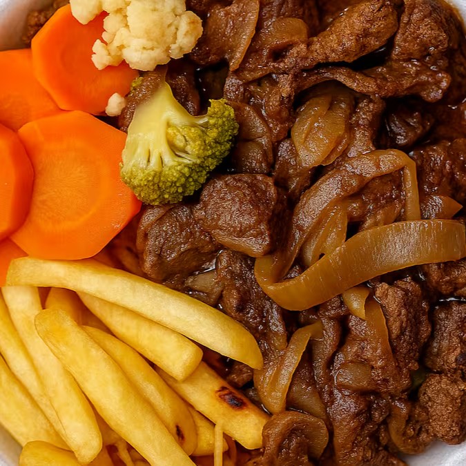 Prato composto pelo Bife de Alcatra Acebolado servido com arroz soltinho, feijão caseiro, macarrão ao alho e óleo e um cremoso purê de batata. Uma refeição completa, saborosa e feita para matar a fome com muito sabor! Marmita indicada para 01 pessoa.