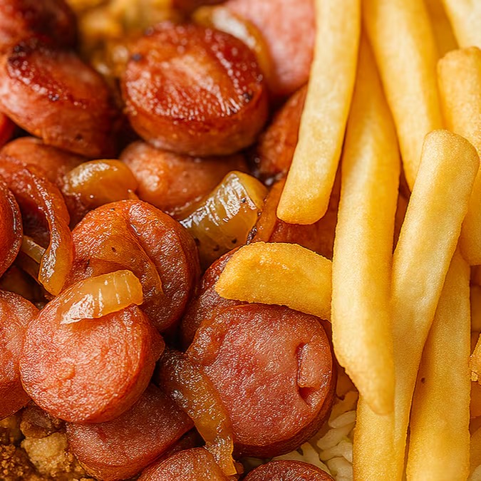 Prato composto pelo mix de carnes (calabresa, frango, carne de boi e toscana fritos e acebolados) servido com arroz soltinho, feijão caseiro, macarrão ao alho e óleo e um cremoso purê de batata. Uma refeição completa, saborosa e feita para matar a fome com muito sabor! Marmita indicada para 01 pessoa.