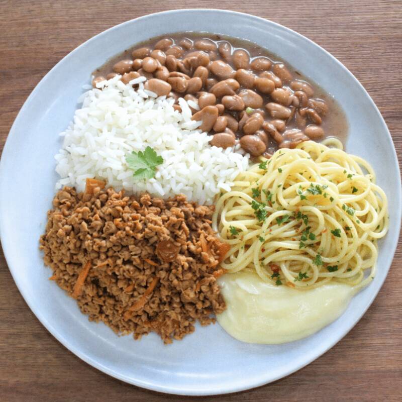 Carne moída com arroz, feijão, macarrão e purê de batata
