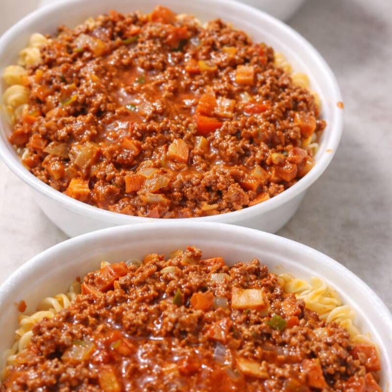 Macarrão com molho de tomate, carne moída, finalizado com orégano, queijo mussarela e queijo ralado