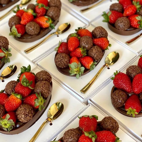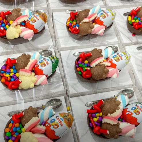 Casca de chocolate (meio amarga ou ao leite) recheada com brigadeiro cremoso, ninho cremoso, nutella, confeitos, marshmallows e brigadeiros, em uma composição alegre e deliciosa
