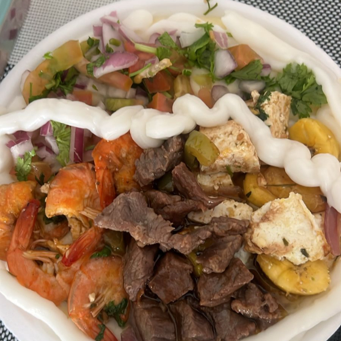 Camarão ,carne do sol ,queijo ricota , banana da terra, catupiry e salada.