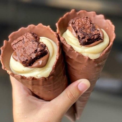 Cascão de sorvete banhado no chocolate com recheio de brigadeiro com brownie.