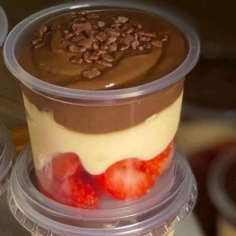 """Prepare o seu coração para esse irresistível copoda felicidade, composto com brigadeiro de Ninho e brigadeiro 50% cacau, mega cremoso, com uma camada de morangos frescos e nosso delicioso brownie com a qualidade que vcs conhecem"""