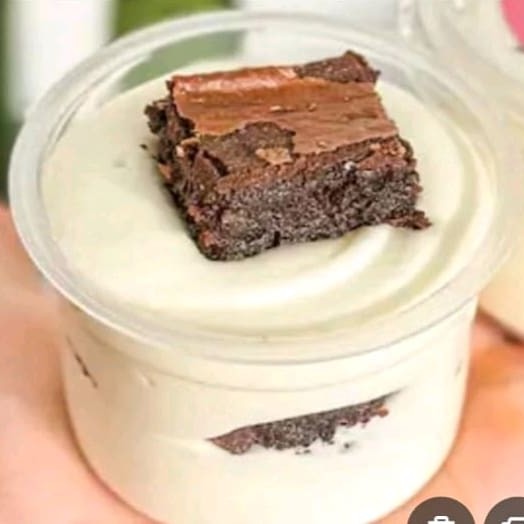 """Irresistível brownie com creme branco que derrete na boca, finalizado com morangos frescos. Sabor perfeito em cada colherada!!!"""